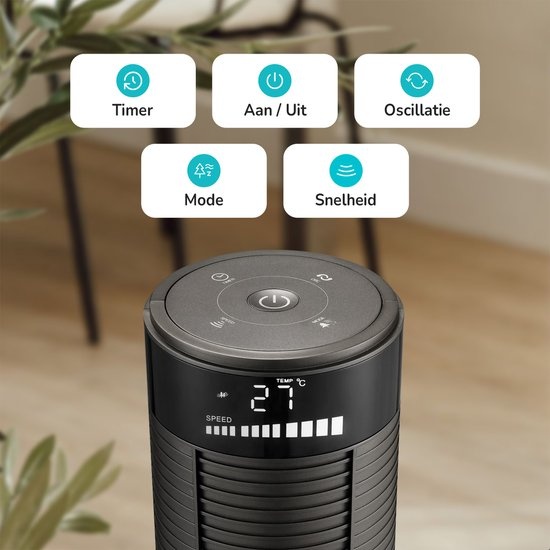 The tower fan has a 90° oscillation function that ensures optimal air circulation in the room. This ensures that the cool air is evenly distributed, which ensures a more pleasant ambient temperature.