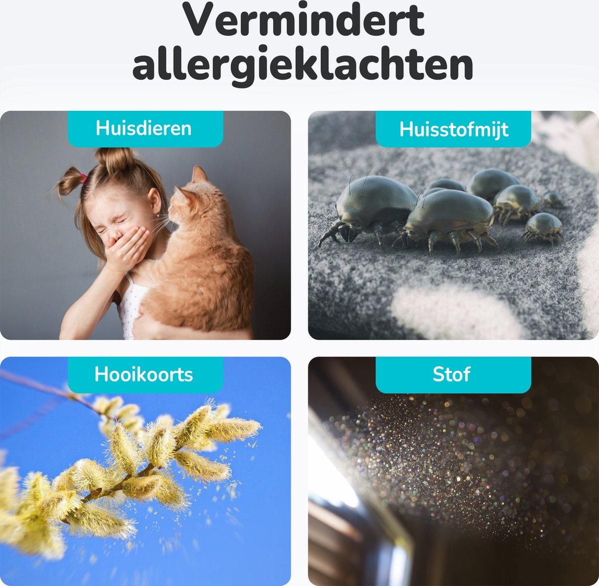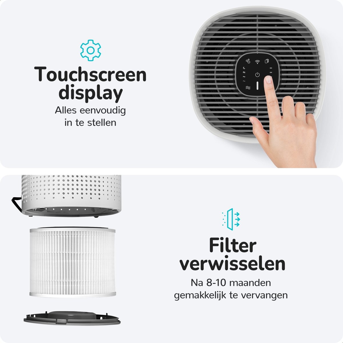 Thanks to the 5-layer filter system, this device can remove no less than 99.97% of unwanted substances from the air, such as viruses, bacteria, pollen and fine dust. The pre-filter first filters the large parts from the air such as hair, dander and dust. Then the air passes through an active carbon filter where all unpleasant odors are removed from the air. Then it goes through the H13 HEPA filter where even the smallest particles are removed, finally it goes through an internal filter. After this, the air is completely cleaned.