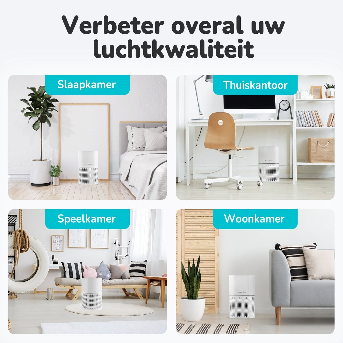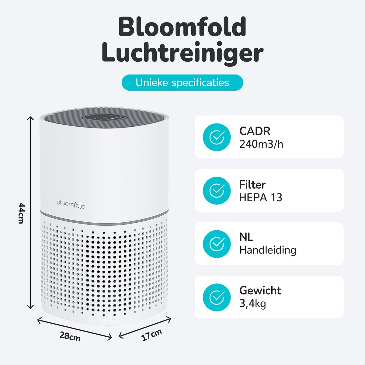 The HEPA filter lasts about 12 months and must then be replaced. These are available separately from Bloomfold. The air purifier can clean 240 cubic meters per hour, so your room is cleaned in no time!
