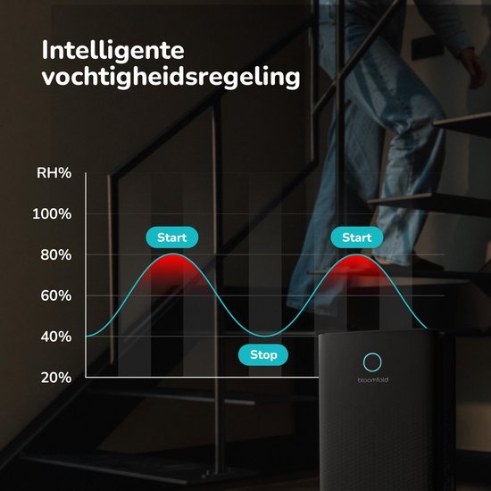 The Bloomfold dehumidifier can remove up to 12 litres of moisture per day , with an energy consumption of only 200 watts. This means comfortable and energy-efficient use during dehumidification.