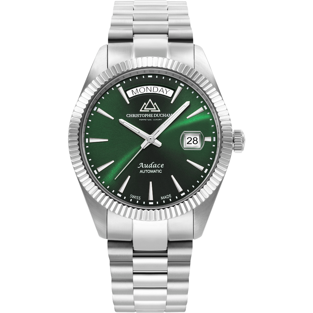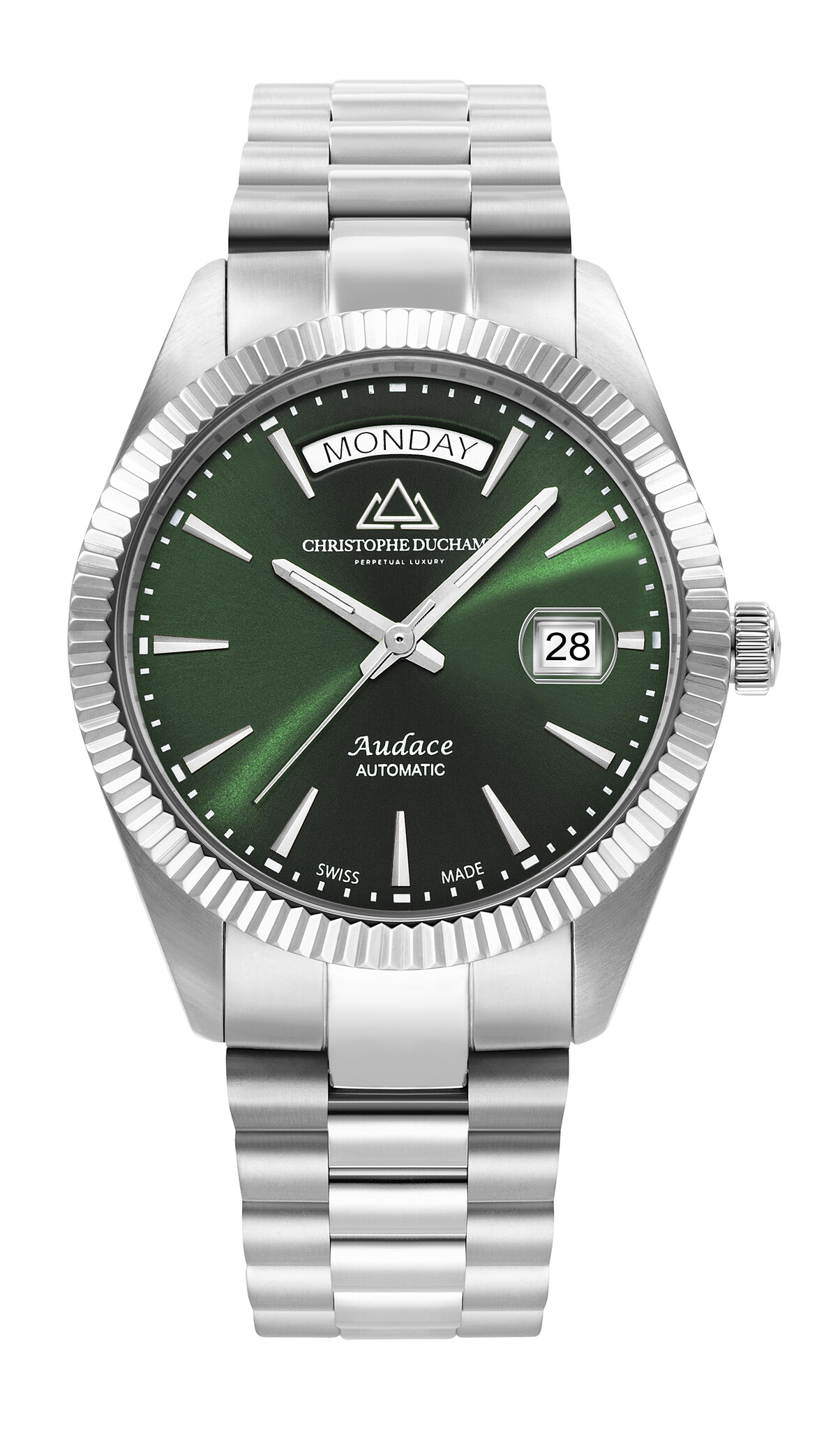 A bold and classic design offering the ultimate simplicity in day date horology. A Swiss made automatic movement encased in stainless steel with a fluted bezel and with president bracelet. The Audace lives up to its name as a timepiece that encapsulates a willingness to take the boldest of risk.