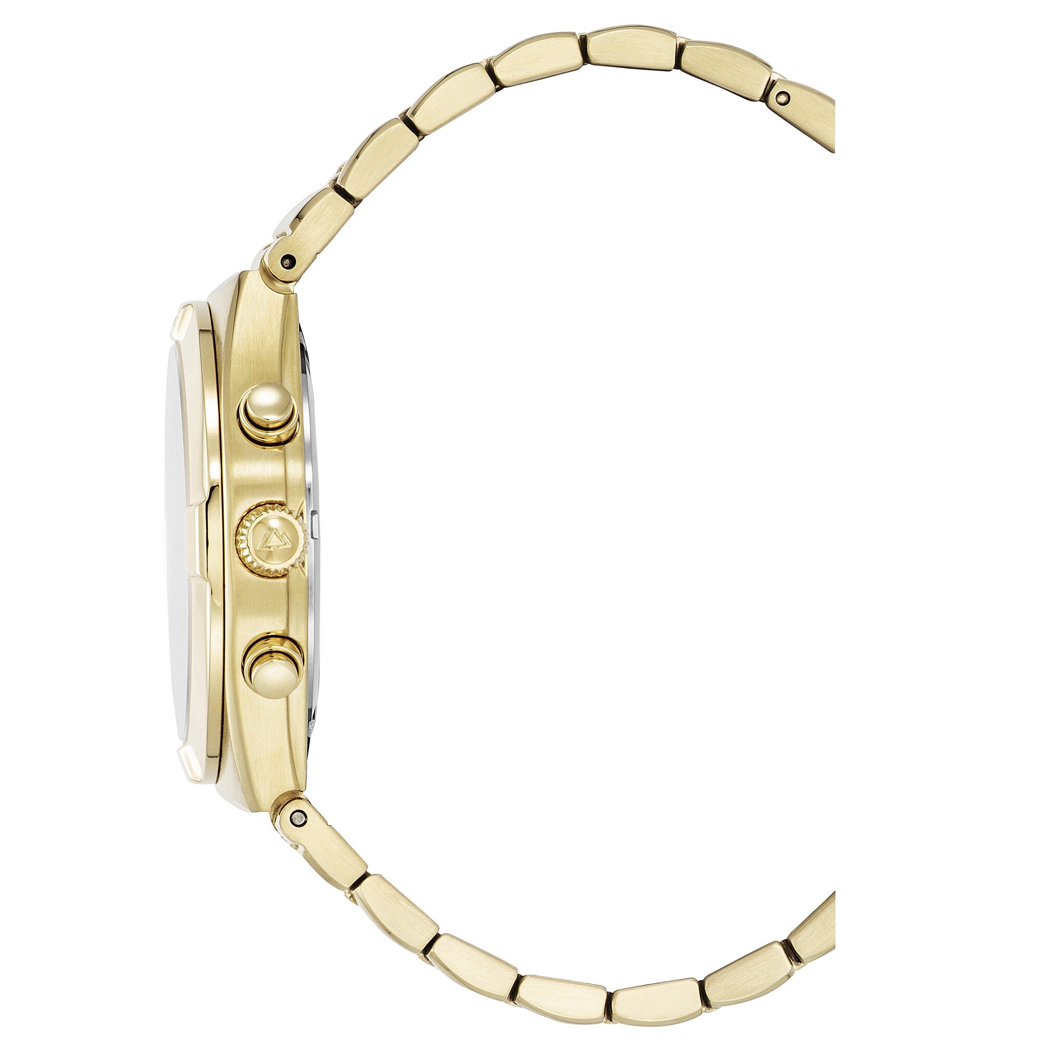 The stainless steel case with a silver and rose gold finish is shaped with bold architectural lines. A matching bracelet with butterfly buckle and partially brushed surfaces completes the design.