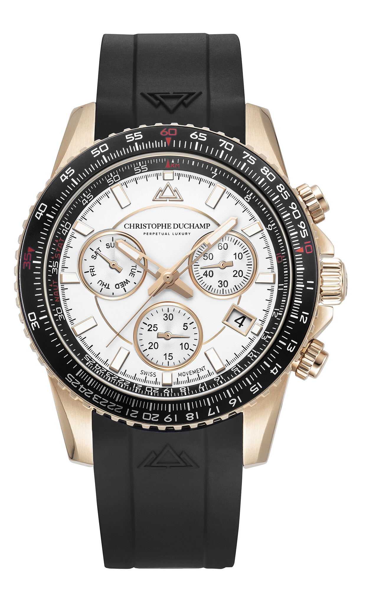 Powered by the Swiss Made Ronda Z60 movement, this chronograph delivers precision with a fully functional navitimer chronograph. The tachymeter bezel and jet-engraved caseback highlight its aviation roots.