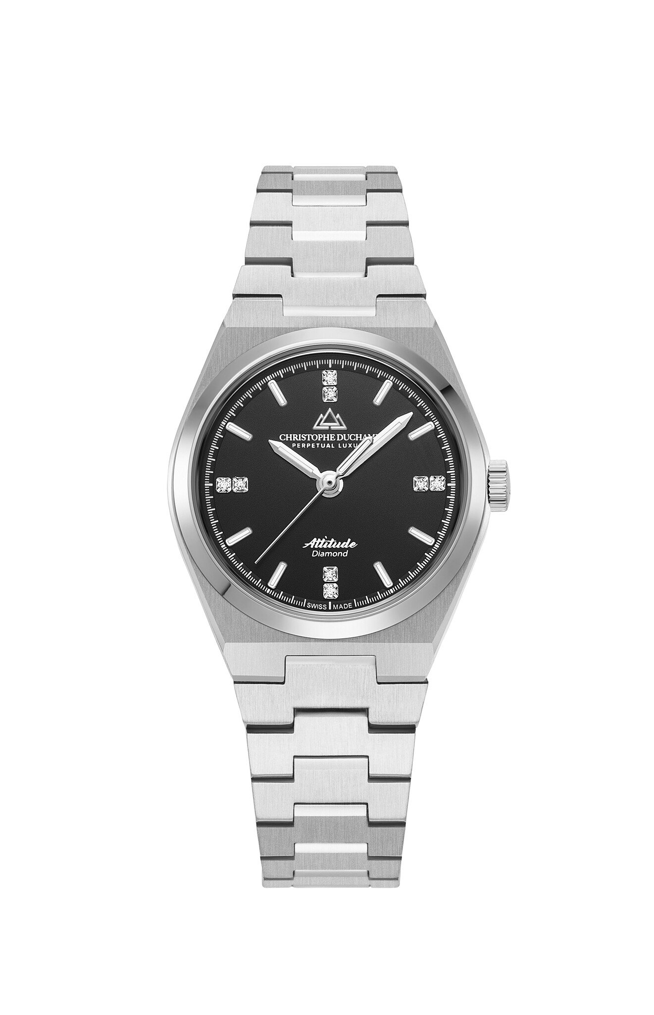 Elegant en stralend, de Attitude Diamond is een ode aan verfijnde vrouwelijkheid. Dit Zwitserse quartzhorloge heeft een prachtig afgewerkte wijzerplaat met zonnestraalmotief, bezet met 8 fonkelende diamanten, en biedt een perfecte balans tussen luxe en eenvoud. De Attitude Diamond is ontworpen om moeiteloos te schitteren, van 's ochtends vroeg tot 's avonds laat, en belichaamt tijdloze elegantie en moderne verfijning.