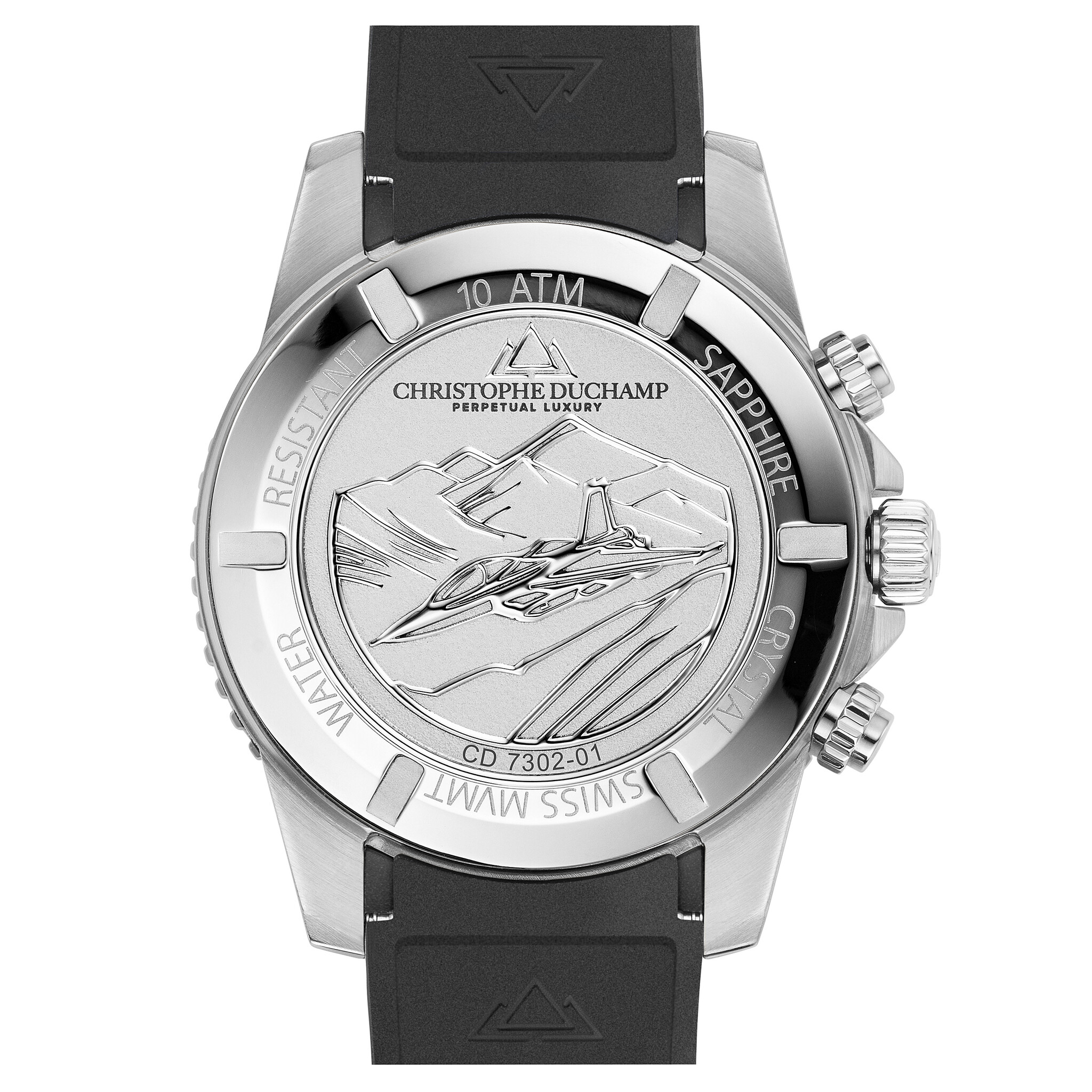 Aangedreven door het Zwitserse Ronda Z60-uurwerk biedt dit model precisie met een volledig functionele navitimer chronograaf. De tachymeter bezel en de gegraveerde caseback met jet-detail benadrukken het luchtvaartkarakter.